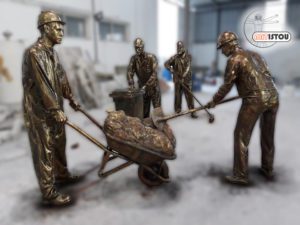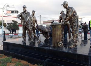 Sculpture de mineurs poussant une charrette, hommage à leur travail et leur engagement.